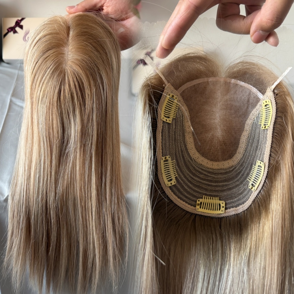 European Human Hair Topper Ash Blonde Highlights Color Clip in 6x7inch Silk Base Topper for Women
