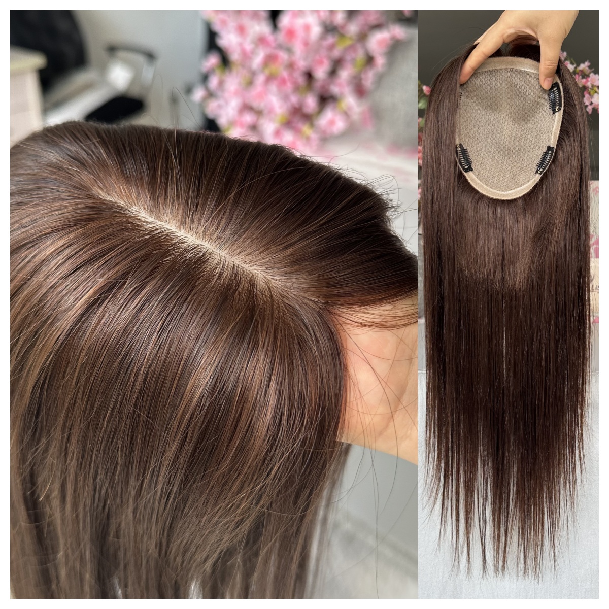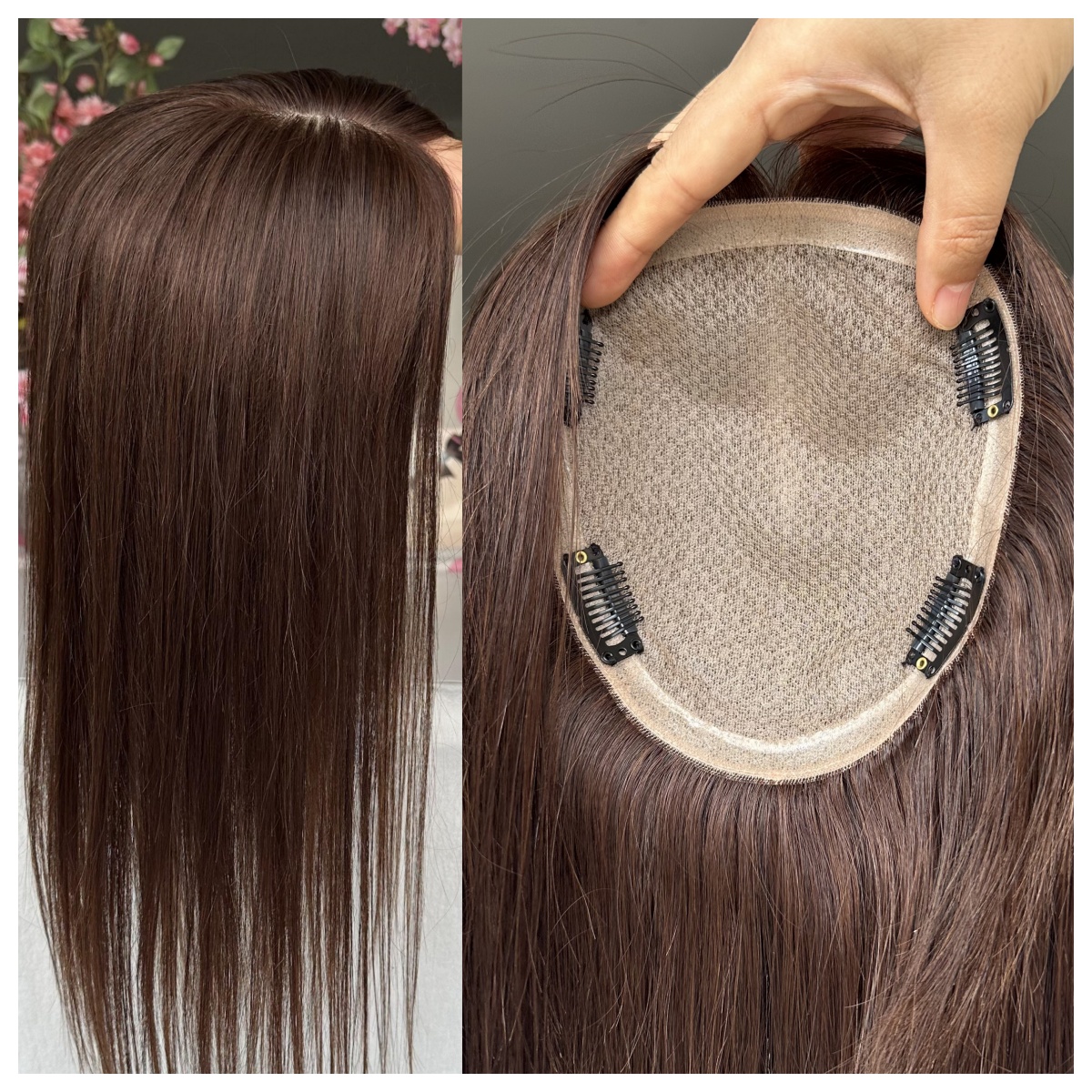 15x17cm Silk Topper Medium Brown Clip-In Hairpiece Natural Human Hair Toupee for Thinning Hair Hair Loss human hair silk base topper color 4 brown