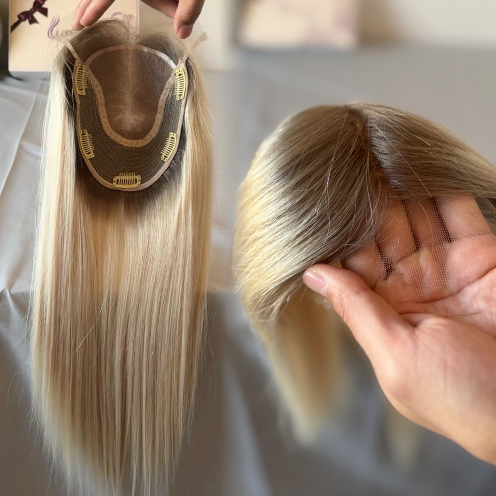 European Human Hair Topper Ash Blonde Highlights Color Clip in 6x7inch Silk Base Topper for Women
