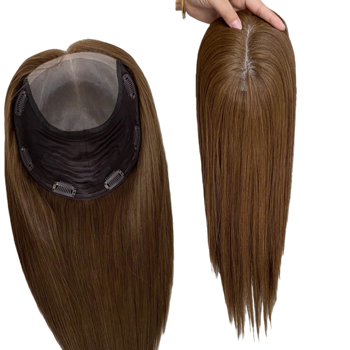 European Remy Human Hair Brown Highlights Invisible Mono Topper Piece Hand Tied for Women Thinning